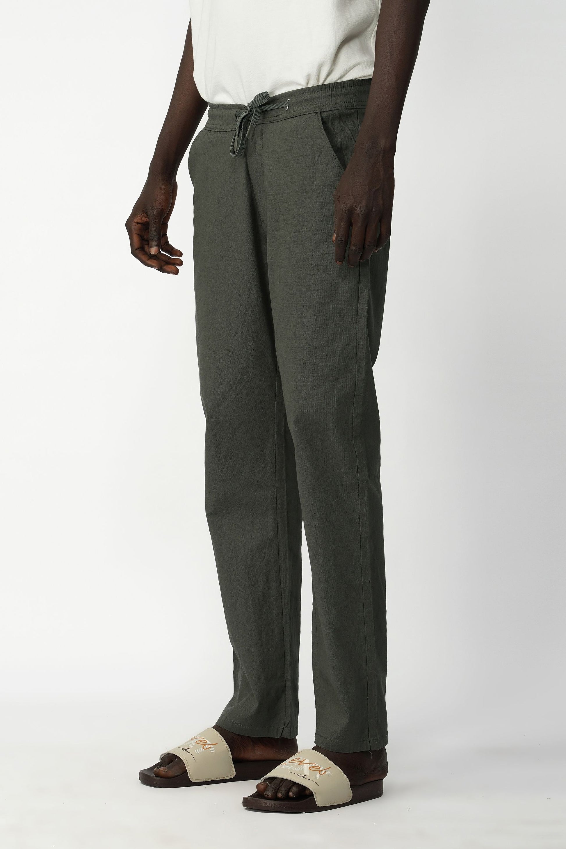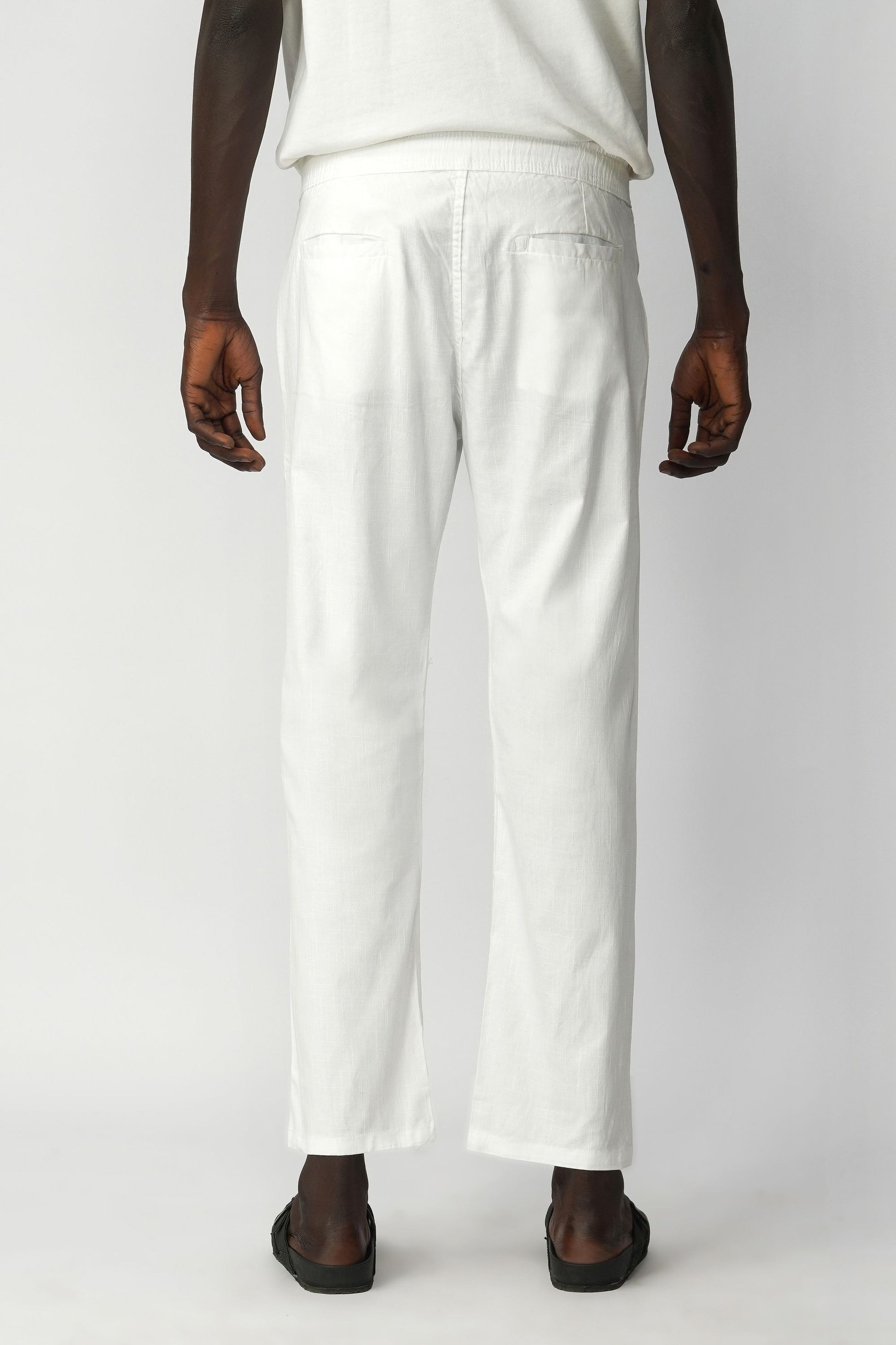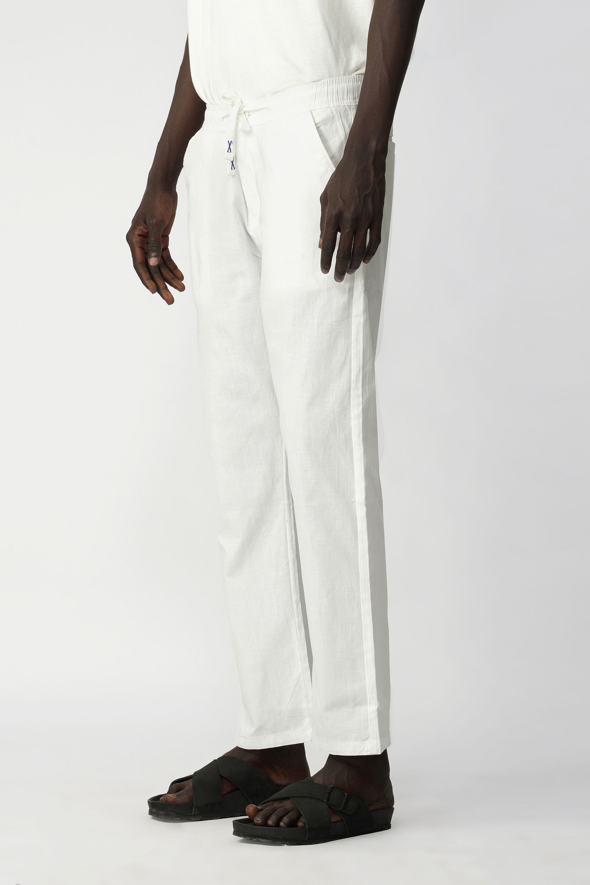 Cotton–Linen blended fabric. Cotton offers softness and comfort, while linen adds breathability and a natural lightweight texture, making the trousers suitable for warm weather and everyday wear.