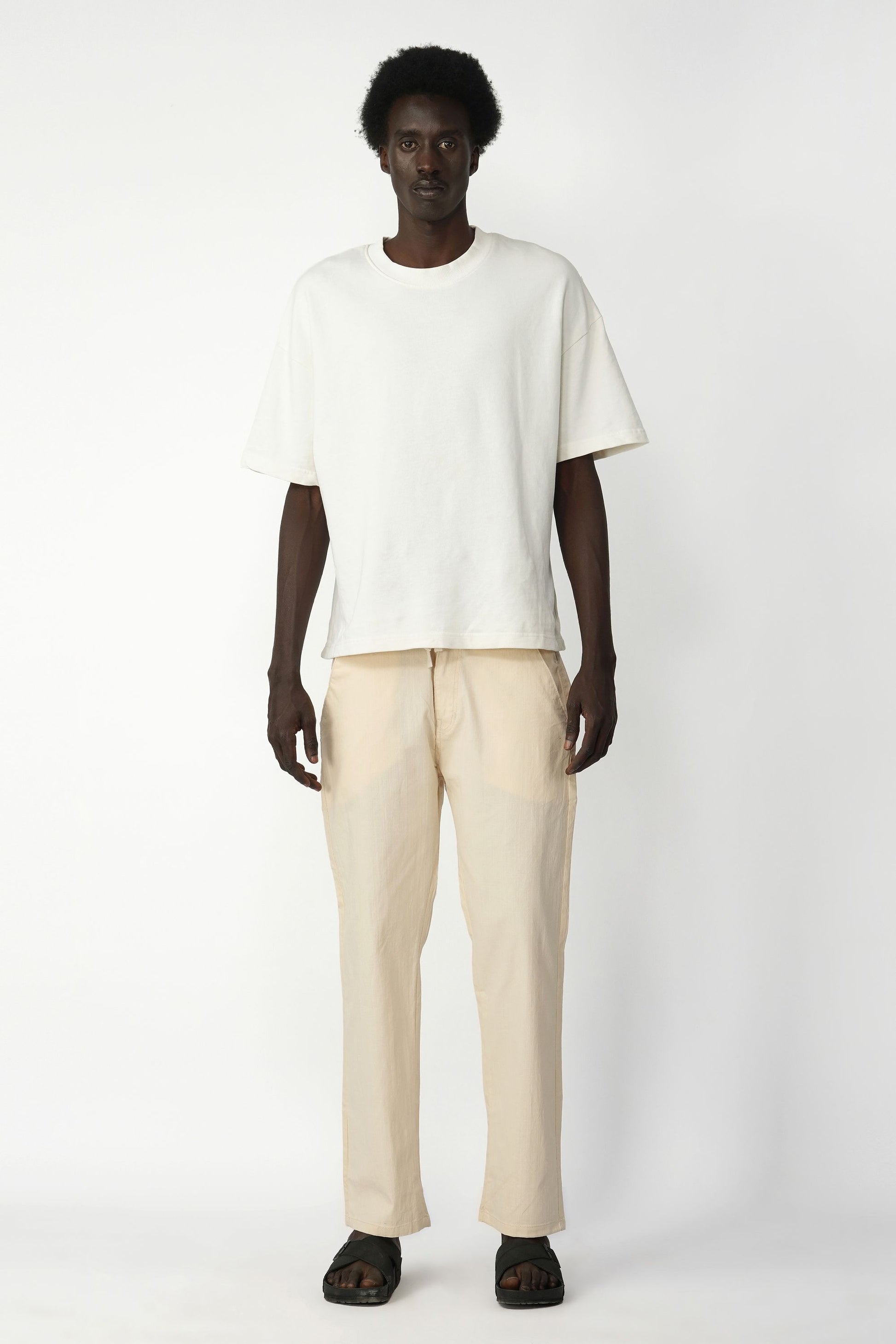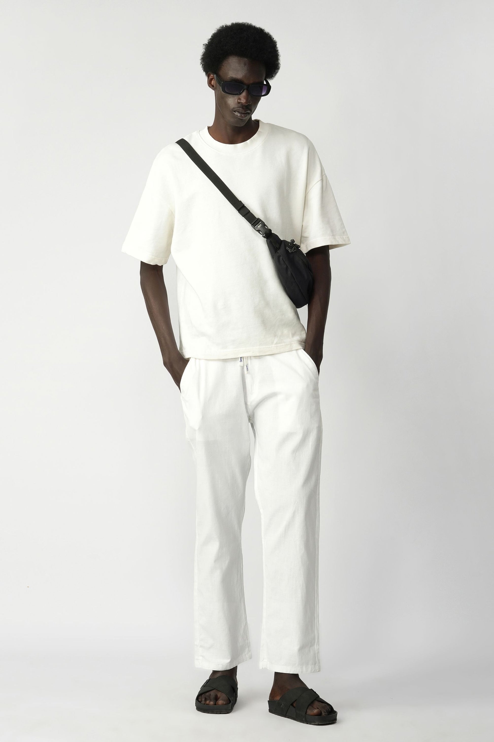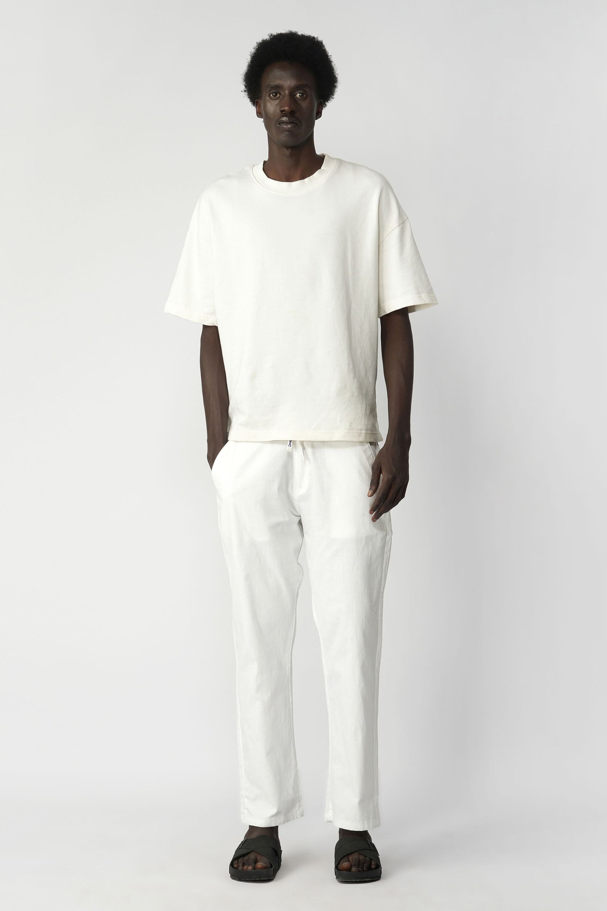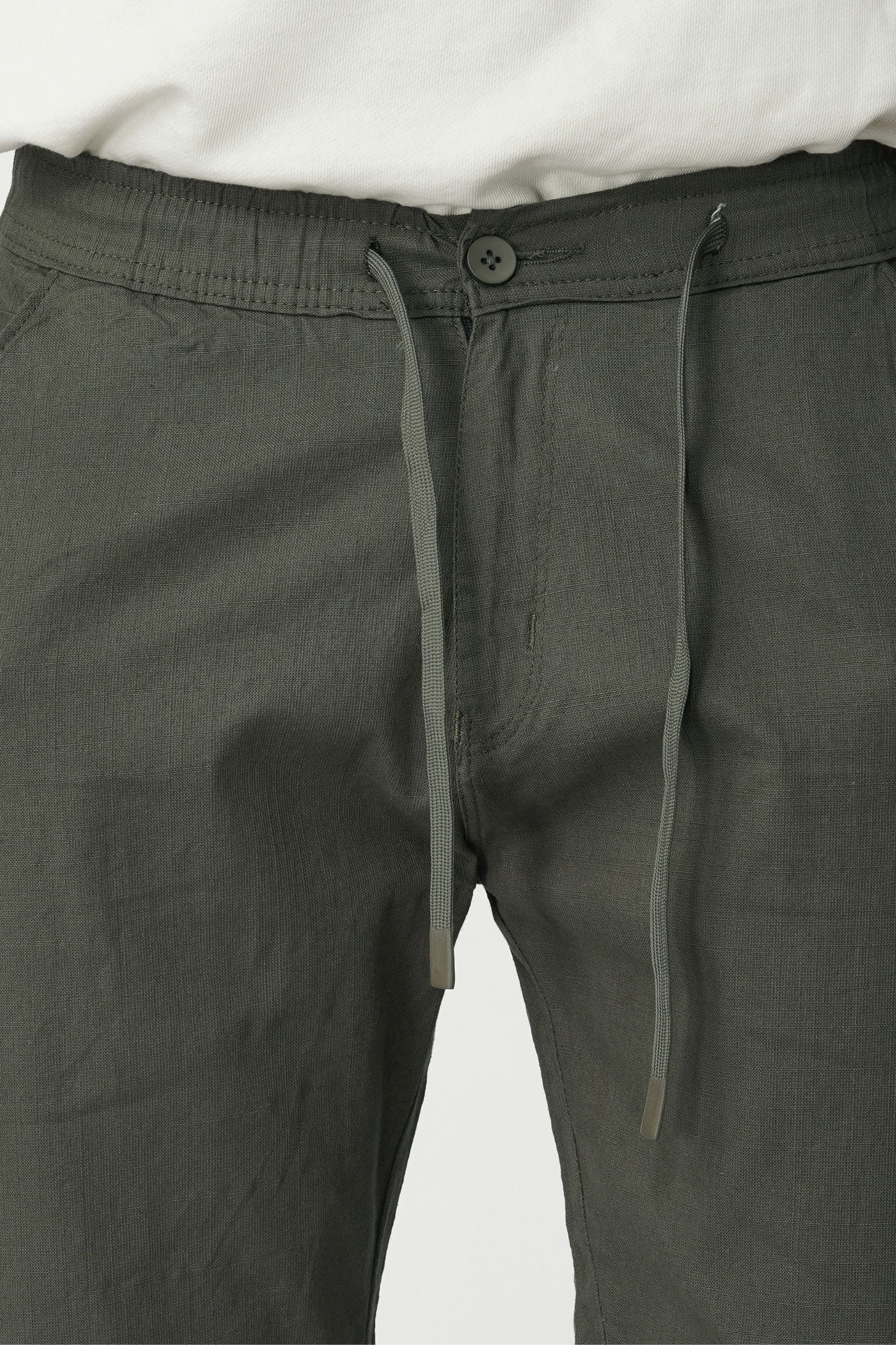 Cotton–Linen blended fabric. Cotton offers softness and comfort, while linen adds breathability and a natural lightweight texture, making the trousers suitable for warm weather and everyday wear.